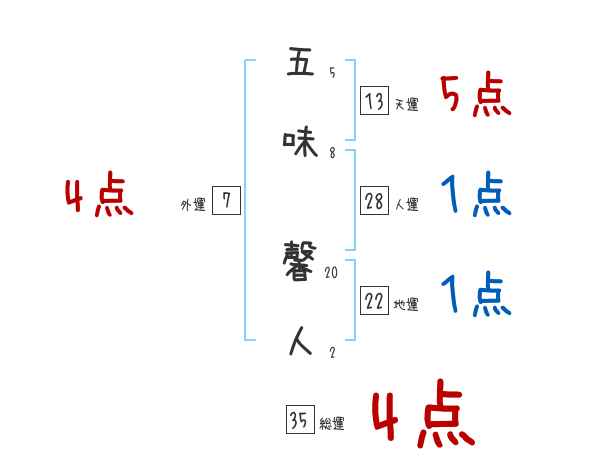 天運![]() | 五味馨人さんの天運は13画の5つ星!才能に恵まれ人気がある。名声を手に入れる。円満な人生。 家系が持つ宿命的な運勢を表します。祖先から受け継いだ苗字ですので自分の力が及びません。家柄を象徴します。 |
