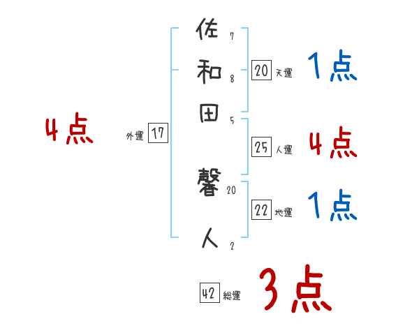 外運![]() | 佐和田馨人さんの外運は17画の4つ星!積極的な行動力。地位を気づき財産を手に入れる。純粋な心と直感力。 生活面を象徴する運勢です。外部から受ける影響力を表し、結婚運、家庭運や職場、環境への順応性を表します。 |