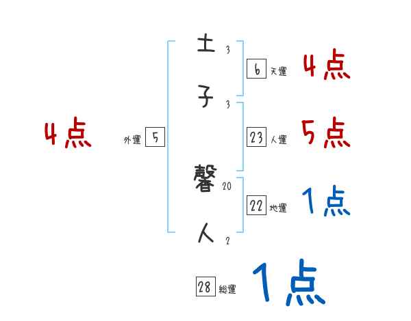 天運![]() | 土子馨人さんの天運は6画の4つ星!慎重な努力家で信頼を得る。誠実な精神で向上心に優れる。 家系が持つ宿命的な運勢を表します。祖先から受け継いだ苗字ですので自分の力が及びません。家柄を象徴します。 |