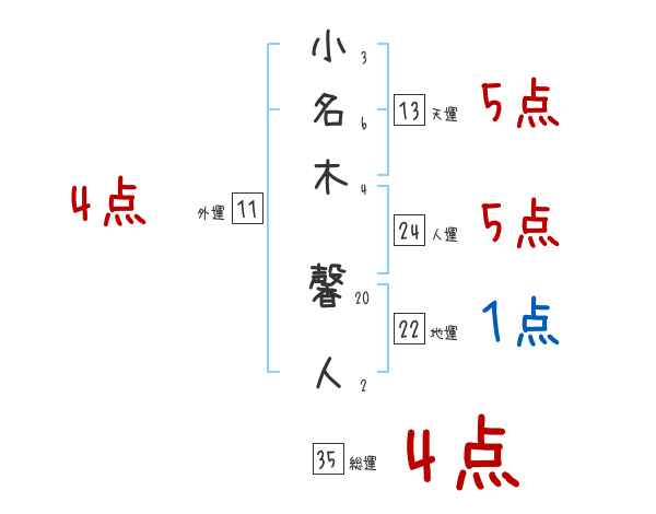 天運![]() | 小名木馨人さんの天運は13画の5つ星!才能に恵まれ人気がある。名声を手に入れる。円満な人生。 家系が持つ宿命的な運勢を表します。祖先から受け継いだ苗字ですので自分の力が及びません。家柄を象徴します。 |