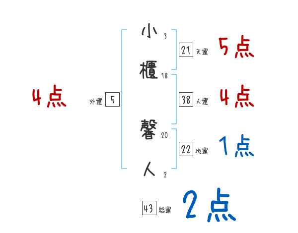 天運![]() | 小櫃馨人さんの天運は21画の5つ星!統率力がある。独立し成功する。名誉を手に入れる。 家系が持つ宿命的な運勢を表します。祖先から受け継いだ苗字ですので自分の力が及びません。家柄を象徴します。 |