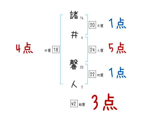 総運![]() | 諸井馨人さんの総運は42画の3つ星!病気に注意。多芸であるが消極的でおとなしい。 あなたの人生を表す1番重要な運勢です。生涯を通じて影響する総合運となり、主に50歳以降の晩年期に影響を及ぼします。 |