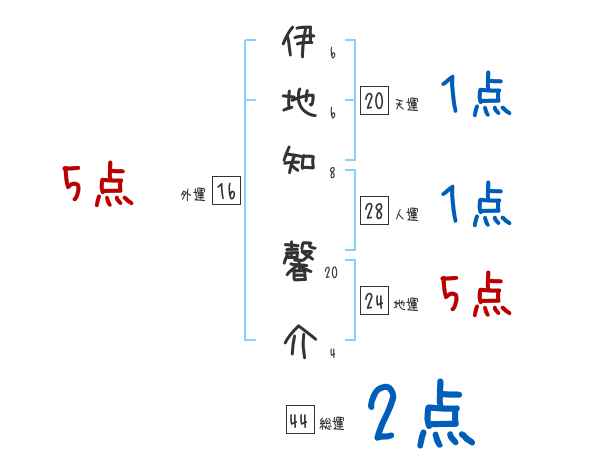 総運![]() | 伊地知馨介さんの総運は44画の2つ星!誠実で慎重な性格。物事を考えすぎないように注意しましょう。 あなたの人生を表す1番重要な運勢です。生涯を通じて影響する総合運となり、主に50歳以降の晩年期に影響を及ぼします。 |
