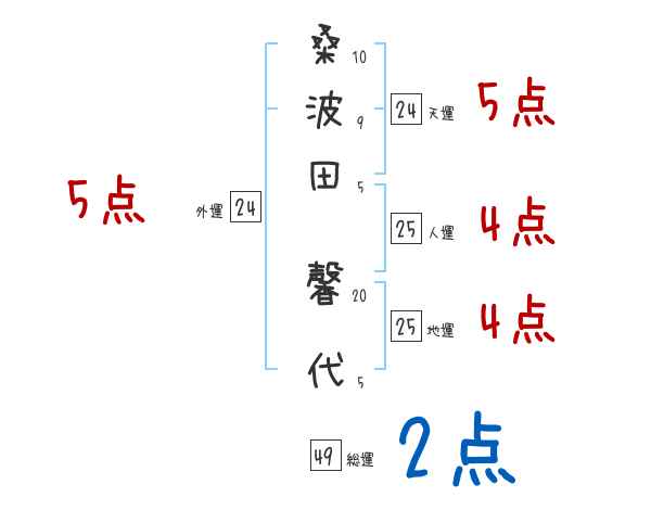 天運![]() | 桑波田馨代さんの天運は24画の5つ星!家庭運が良く順調な人生。金運にも恵まれる。 家系が持つ宿命的な運勢を表します。祖先から受け継いだ苗字ですので自分の力が及びません。家柄を象徴します。 |