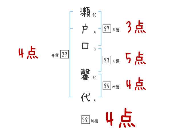 総運![]() | 瀬戸口馨代さんの総運は52画の4つ星!先見性と独創性に優れ考える力がある。強運の持ち主。 あなたの人生を表す1番重要な運勢です。生涯を通じて影響する総合運となり、主に50歳以降の晩年期に影響を及ぼします。 |