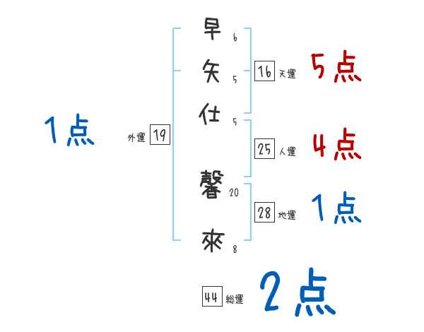 天運![]() | 早矢仕馨來さんの天運は16画の5つ星!人望が厚く大きく発展する。逆転成功が見える。 家系が持つ宿命的な運勢を表します。祖先から受け継いだ苗字ですので自分の力が及びません。家柄を象徴します。 |