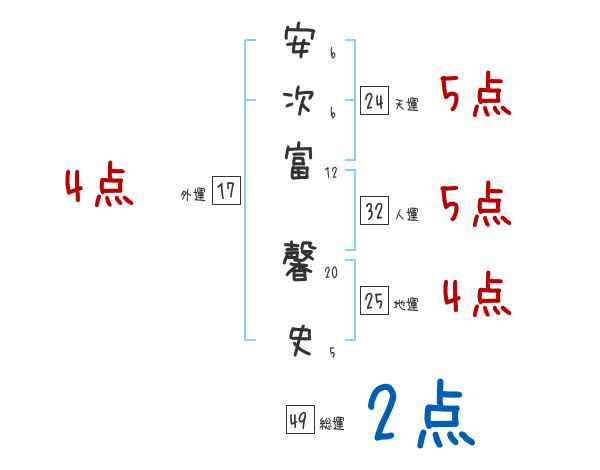天運![]() | 安次富馨史さんの天運は24画の5つ星!家庭運が良く順調な人生。金運にも恵まれる。 家系が持つ宿命的な運勢を表します。祖先から受け継いだ苗字ですので自分の力が及びません。家柄を象徴します。 |