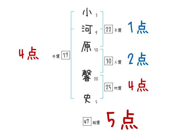 総運![]() | 小河原馨史さんの総運は47画の5つ星!実力が開花し発展する円満な人生。財に恵まれる。 あなたの人生を表す1番重要な運勢です。生涯を通じて影響する総合運となり、主に50歳以降の晩年期に影響を及ぼします。 |