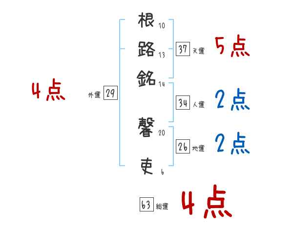 外運![]() | 根路銘馨吏さんの外運は29画の4つ星!完全主義で才能がある。厳格な心の持ち主。 生活面を象徴する運勢です。外部から受ける影響力を表し、結婚運、家庭運や職場、環境への順応性を表します。 |
