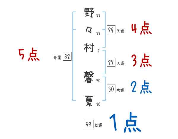 外運![]() | 野々村馨夏さんの外運は32画の5つ星!柔軟性があり成功する。チャンスが多く金運が良い。 生活面を象徴する運勢です。外部から受ける影響力を表し、結婚運、家庭運や職場、環境への順応性を表します。 |