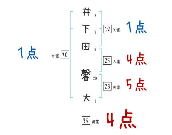 総運![]() | 井下田馨大さんの総運は35画の4つ星!温厚な性格で感受性が高い。穏和な性格で人望が厚い。 あなたの人生を表す1番重要な運勢です。生涯を通じて影響する総合運となり、主に50歳以降の晩年期に影響を及ぼします。 |