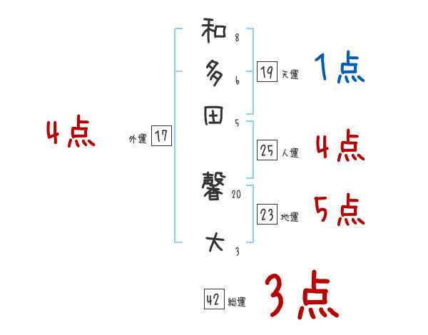 外運![]() | 和多田馨大さんの外運は17画の4つ星!積極的な行動力。地位を気づき財産を手に入れる。純粋な心と直感力。 生活面を象徴する運勢です。外部から受ける影響力を表し、結婚運、家庭運や職場、環境への順応性を表します。 |