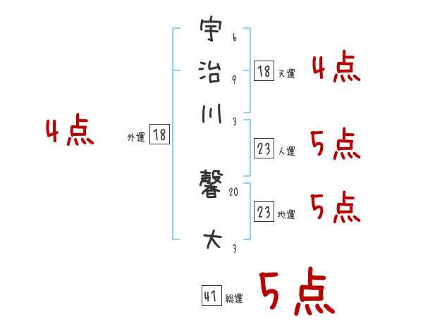 外運![]() | 宇治川馨大さんの外運は18画の4つ星!情熱的で剛気。忍耐力があり信頼される。 生活面を象徴する運勢です。外部から受ける影響力を表し、結婚運、家庭運や職場、環境への順応性を表します。 |