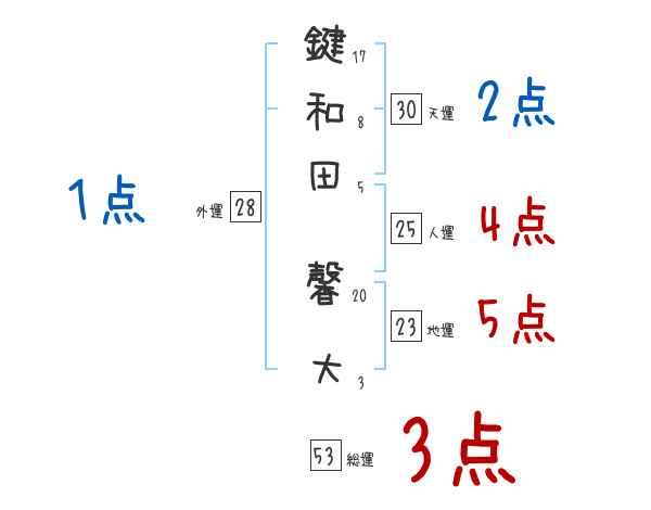 総運![]() | 鍵和田馨大さんの総運は53画の3つ星!やや見栄っ張りで虚栄心がある。散財に注意。 あなたの人生を表す1番重要な運勢です。生涯を通じて影響する総合運となり、主に50歳以降の晩年期に影響を及ぼします。 |