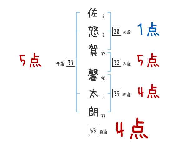 天運![]() | 佐怒賀馨太朗さんの天運は28画の1つ星!家庭環境に注意。スポーツで活躍できる能力があるかも。 家系が持つ宿命的な運勢を表します。祖先から受け継いだ苗字ですので自分の力が及びません。家柄を象徴します。 |