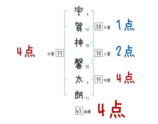 外運![]() | 宇賀神馨太朗さんの外運は33画の4つ星!権力志向でプライドが高い。勇気があり運を切り開き成功する。 生活面を象徴する運勢です。外部から受ける影響力を表し、結婚運、家庭運や職場、環境への順応性を表します。 |