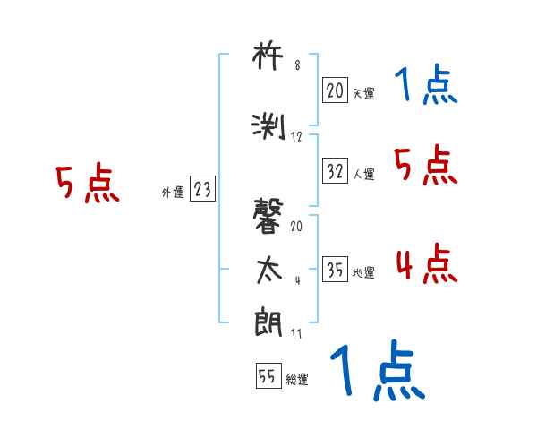 人運![]() | 杵渕馨太朗さんの人運は32画の5つ星!柔軟性があり成功する。チャンスが多く金運が良い。 性格や才能などを表す2番目に重要な運勢です。人間関係や協調性、社会的な成功に影響します。主に20歳から50歳ぐらいまでの中年期の運勢を表します。 |