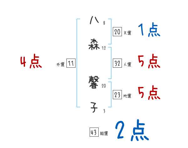 人運![]() | 八森馨子さんの人運は32画の5つ星!柔軟性があり成功する。チャンスが多く金運が良い。 性格や才能などを表す2番目に重要な運勢です。人間関係や協調性、社会的な成功に影響します。主に20歳から50歳ぐらいまでの中年期の運勢を表します。 |