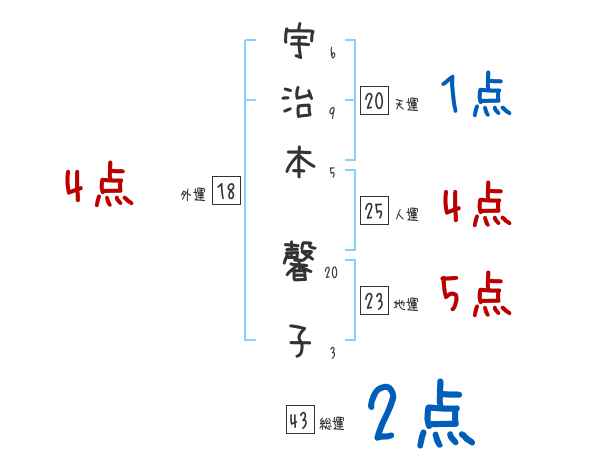 総運![]() | 宇治本馨子さんの総運は43画の2つ星!頑固な性格で独立心が強いかも。やや非現実的で浪費に注意しましょう。 あなたの人生を表す1番重要な運勢です。生涯を通じて影響する総合運となり、主に50歳以降の晩年期に影響を及ぼします。 |
