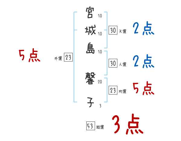 天運![]() | 宮城島馨子さんの天運は30画の2つ星!浮き沈みの激しさに注意しましょう。 家系が持つ宿命的な運勢を表します。祖先から受け継いだ苗字ですので自分の力が及びません。家柄を象徴します。 |