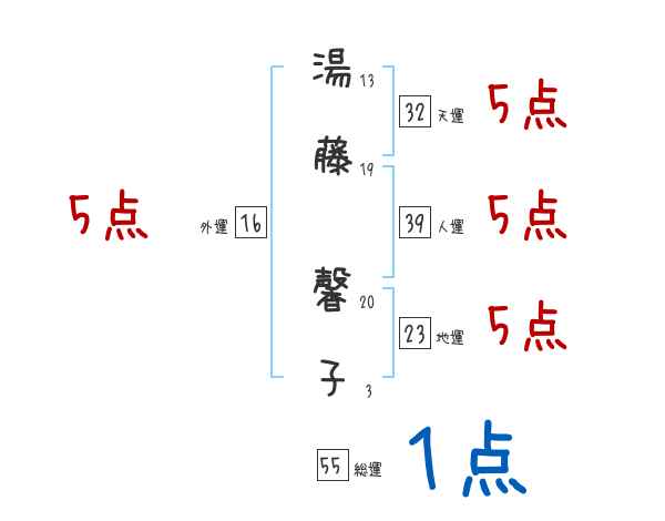 天運![]() | 湯藤馨子さんの天運は32画の5つ星!柔軟性があり成功する。チャンスが多く金運が良い。 家系が持つ宿命的な運勢を表します。祖先から受け継いだ苗字ですので自分の力が及びません。家柄を象徴します。 |