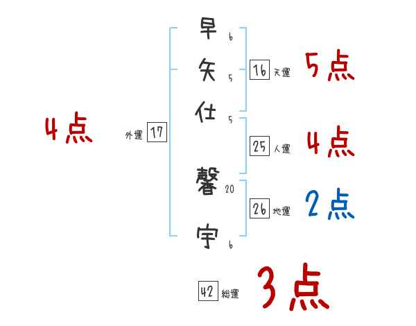 外運![]() | 早矢仕馨宇さんの外運は17画の4つ星!積極的な行動力。地位を気づき財産を手に入れる。純粋な心と直感力。 生活面を象徴する運勢です。外部から受ける影響力を表し、結婚運、家庭運や職場、環境への順応性を表します。 |