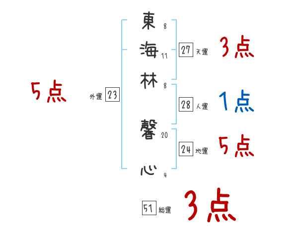 総運![]() | 東海林馨心さんの総運は51画の3つ星!変化が激しく、危険に注意。堅実な性格。 あなたの人生を表す1番重要な運勢です。生涯を通じて影響する総合運となり、主に50歳以降の晩年期に影響を及ぼします。 |