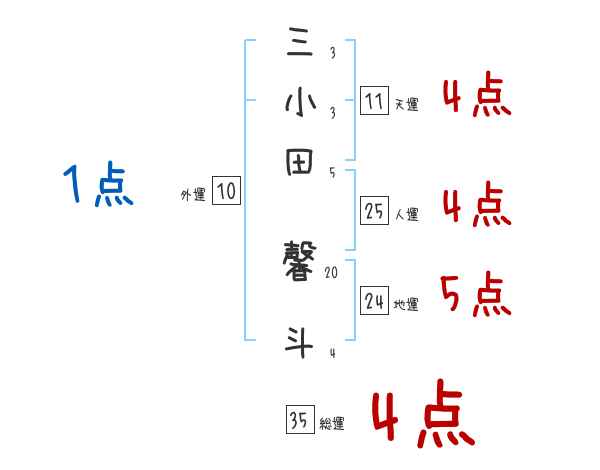 天運![]() | 三小田馨斗さんの天運は11画の4つ星!着実に富や地位を得る幸運な人生。 家系が持つ宿命的な運勢を表します。祖先から受け継いだ苗字ですので自分の力が及びません。家柄を象徴します。 |