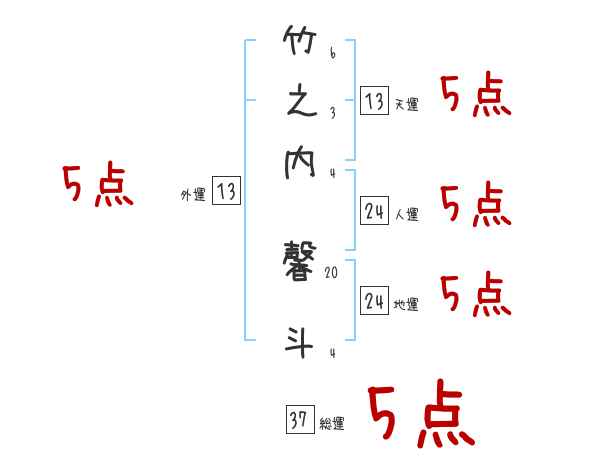 | 外運  | 竹之内馨斗さんの外運は13画の5つ星!才能に恵まれ人気がある。名声を手に入れる。円満な人生。生活面を象徴する運勢です。外部から受ける影響力を表し、結婚運、家庭運や職場、環境への順応性を表します。 |