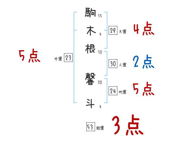 総運![]() | 駒木根馨斗さんの総運は53画の3つ星!やや見栄っ張りで虚栄心がある。散財に注意。 あなたの人生を表す1番重要な運勢です。生涯を通じて影響する総合運となり、主に50歳以降の晩年期に影響を及ぼします。 |