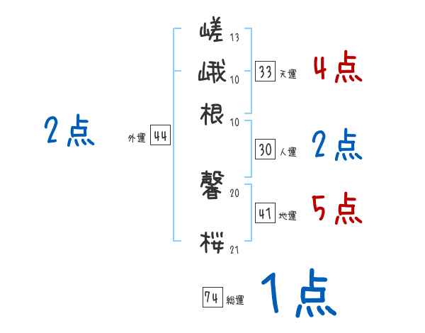 天運![]() | 嵯峨根馨桜さんの天運は33画の4つ星!権力志向でプライドが高い。勇気があり運を切り開き成功する。 家系が持つ宿命的な運勢を表します。祖先から受け継いだ苗字ですので自分の力が及びません。家柄を象徴します。 |