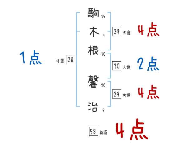 天運![]() | 駒木根馨治さんの天運は29画の4つ星!完全主義で才能がある。厳格な心の持ち主。 家系が持つ宿命的な運勢を表します。祖先から受け継いだ苗字ですので自分の力が及びません。家柄を象徴します。 |