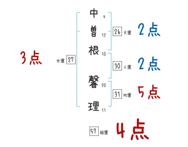 外運![]() | 中曽根馨理さんの外運は27画の3つ星!頭脳明晰だが強情で摩擦が多い傾向。孤立に注意。 生活面を象徴する運勢です。外部から受ける影響力を表し、結婚運、家庭運や職場、環境への順応性を表します。 |