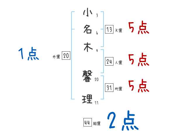総運![]() | 小名木馨理さんの総運は44画の2つ星!誠実で慎重な性格。物事を考えすぎないように注意しましょう。 あなたの人生を表す1番重要な運勢です。生涯を通じて影響する総合運となり、主に50歳以降の晩年期に影響を及ぼします。 |