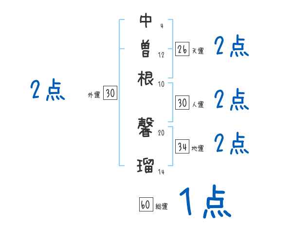 総運![]() | 中曽根馨瑠さんの総運は60画の1つ星!悲観的で迷いやすい。波乱が多く損をしないように。 あなたの人生を表す1番重要な運勢です。生涯を通じて影響する総合運となり、主に50歳以降の晩年期に影響を及ぼします。 |