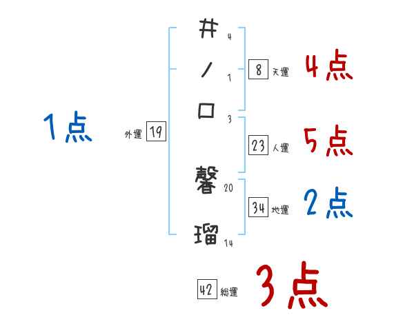 人運![]() | 井ノ口馨瑠さんの人運は23画の5つ星!想像力に優れ活力がある。一代で成功し名誉を手に入れる。 性格や才能などを表す2番目に重要な運勢です。人間関係や協調性、社会的な成功に影響します。主に20歳から50歳ぐらいまでの中年期の運勢を表します。 |