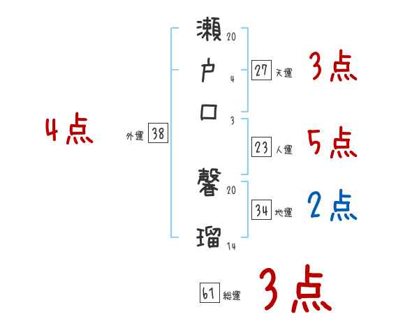 外運![]()  | 瀬戸口馨瑠さんの外運は38画の4つ星!温厚な性格で技術的な才能を発揮する。職人的な仕事に向いている。 生活面を象徴する運勢です。外部から受ける影響力を表し、結婚運、家庭運や職場、環境への順応性を表します。 |