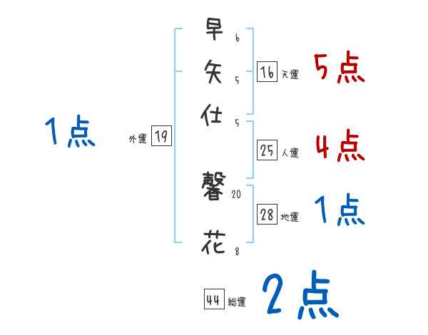 地運![]() | 早矢仕馨花さんの地運は28画の1つ星!家庭環境に注意。スポーツで活躍できる能力があるかも。 個性を表す基礎的な運勢です。性格形成や対人関係、行動力など家庭環境に影響されます。主に誕生してから20歳くらいまでの若年期の運勢を表します。 |