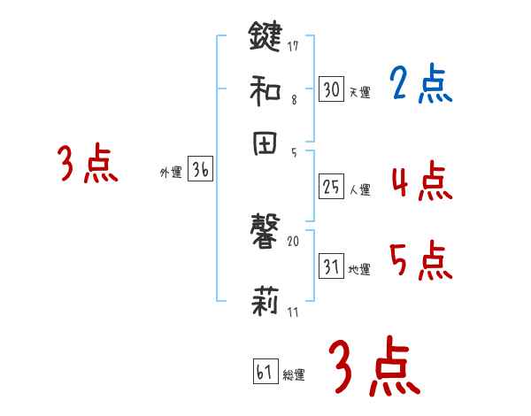 天運![]() | 鍵和田馨莉さんの天運は30画の2つ星!浮き沈みの激しさに注意しましょう。 家系が持つ宿命的な運勢を表します。祖先から受け継いだ苗字ですので自分の力が及びません。家柄を象徴します。 |