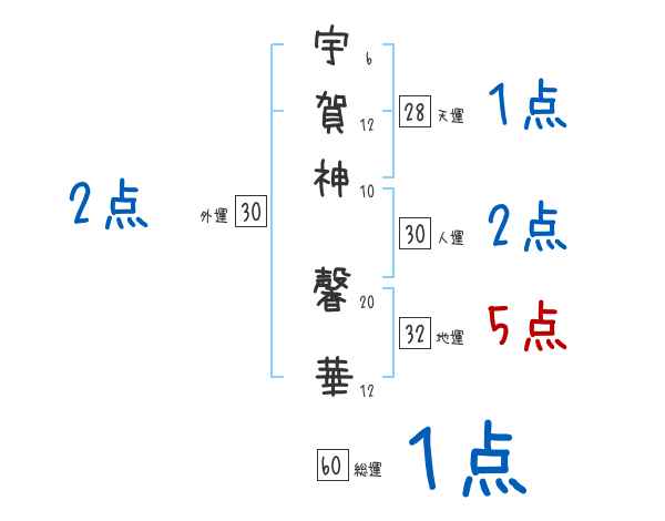 天運![]() | 宇賀神馨華さんの天運は28画の1つ星!家庭環境に注意。スポーツで活躍できる能力があるかも。 家系が持つ宿命的な運勢を表します。祖先から受け継いだ苗字ですので自分の力が及びません。家柄を象徴します。 |