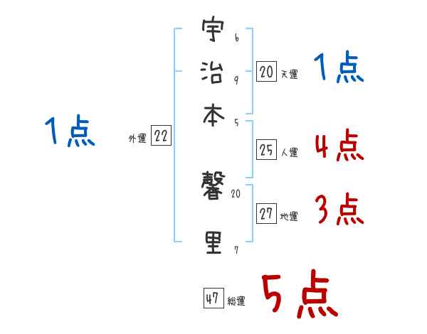 天運![]() | 宇治本馨里さんの天運は20画の1つ星!社交が苦手。人とは違った才能があり波乱万丈な人生かも。 家系が持つ宿命的な運勢を表します。祖先から受け継いだ苗字ですので自分の力が及びません。家柄を象徴します。 |