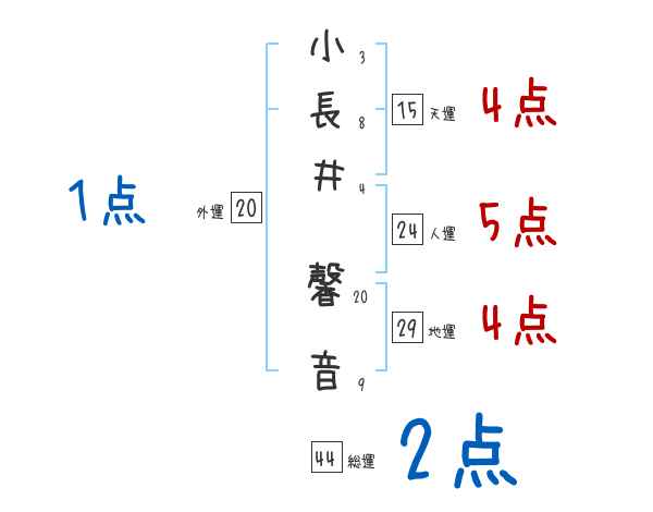 総運![]() | 小長井馨音さんの総運は44画の2つ星!誠実で慎重な性格。物事を考えすぎないように注意しましょう。 あなたの人生を表す1番重要な運勢です。生涯を通じて影響する総合運となり、主に50歳以降の晩年期に影響を及ぼします。 |