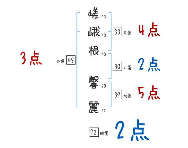 総運![]() | 嵯峨根馨麗さんの総運は72画の2つ星!災難が多く不安定な生活にならないように注意。明暗のある人生かも。 あなたの人生を表す1番重要な運勢です。生涯を通じて影響する総合運となり、主に50歳以降の晩年期に影響を及ぼします。 |