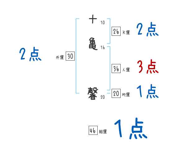 天運![]() | 十亀馨さんの天運は26画の2つ星!波瀾万丈かも。信頼できる人を大事にしましょう。 家系が持つ宿命的な運勢を表します。祖先から受け継いだ苗字ですので自分の力が及びません。家柄を象徴します。 |
