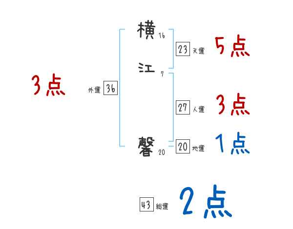 天運![]() | 横江馨さんの天運は23画の5つ星!想像力に優れ活力がある。一代で成功し名誉を手に入れる。 家系が持つ宿命的な運勢を表します。祖先から受け継いだ苗字ですので自分の力が及びません。家柄を象徴します。 |