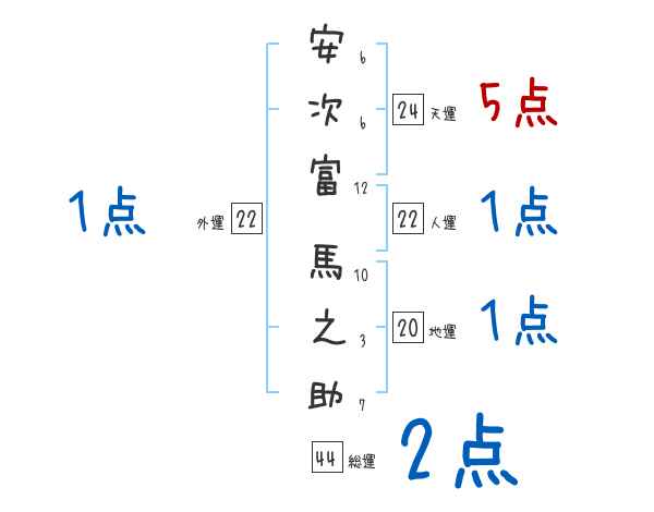 外運![]() | 安次富馬之助さんの外運は22画の1つ星!努力することが苦手ないっぽう手先が器用。芸術性にも優れる。 生活面を象徴する運勢です。外部から受ける影響力を表し、結婚運、家庭運や職場、環境への順応性を表します。 |