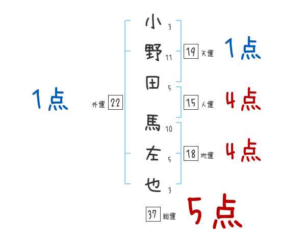 外運![]() | 小野田馬左也さんの外運は22画の1つ星!努力することが苦手ないっぽう手先が器用。芸術性にも優れる。 生活面を象徴する運勢です。外部から受ける影響力を表し、結婚運、家庭運や職場、環境への順応性を表します。 |