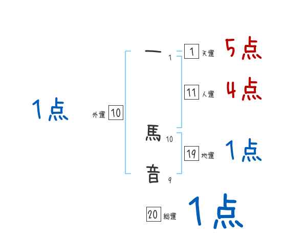 天運![]() | 一馬音さんの天運は1画の5つ星!行動力、指導力があり出世し繁栄する。幸運に恵まれる。 家系が持つ宿命的な運勢を表します。祖先から受け継いだ苗字ですので自分の力が及びません。家柄を象徴します。 |