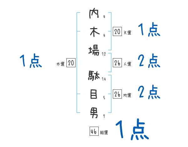 総運![]() | 内木場駄目男さんの総運は46画の1つ星!迷走することが多く苦労するかも。目先のことにとらわれないように。 あなたの人生を表す1番重要な運勢です。生涯を通じて影響する総合運となり、主に50歳以降の晩年期に影響を及ぼします。 |