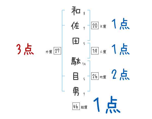 外運![]() | 和佐田駄目男さんの外運は27画の3つ星!頭脳明晰だが強情で摩擦が多い傾向。孤立に注意。 生活面を象徴する運勢です。外部から受ける影響力を表し、結婚運、家庭運や職場、環境への順応性を表します。 |